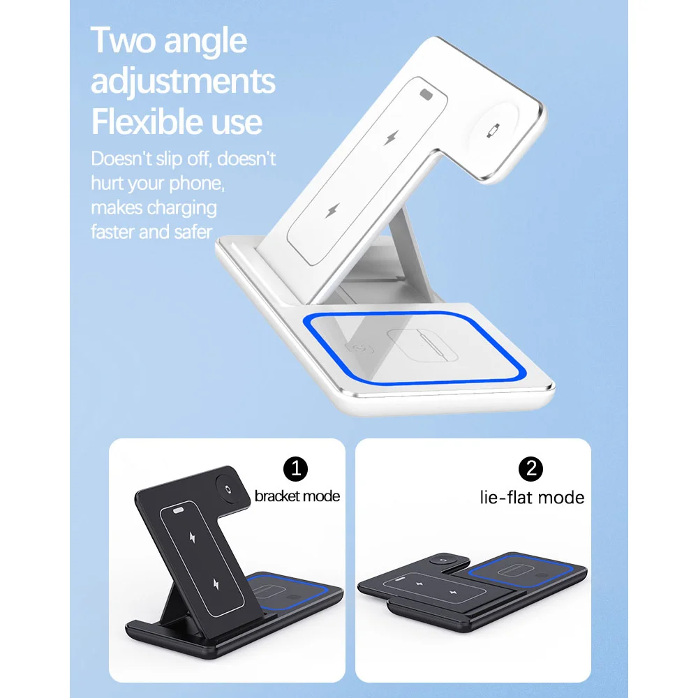 COM DUPLO DESIGN DE COIL DE CARREGAMENTO: A nova estação de carregamento sem fio 3 em 1 2024 pode fornecer uma experiência de carregamento mais estável sem o carregamento intermitente ou o superaquecimento causado pela incompatibilidade. Melhorou a velocidade de carregamento, eliminar o incômodo de encontrar o "Melhor Localização".